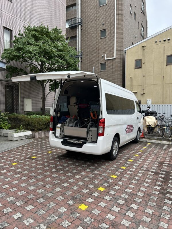 リフトを使って車内にご搭乗。お付き添いの娘様と補助スタッフが同乗したところで亀有病院に向け出発。