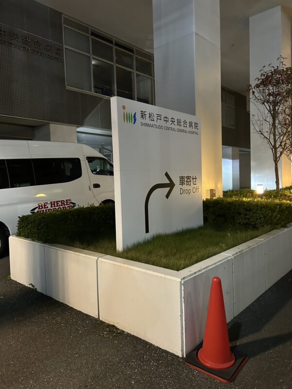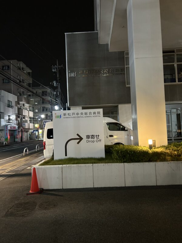 深夜の為、道も空いていて一般道を使い40分程で新松戸中央総合病院に到着。病院のインターホンで患者様の