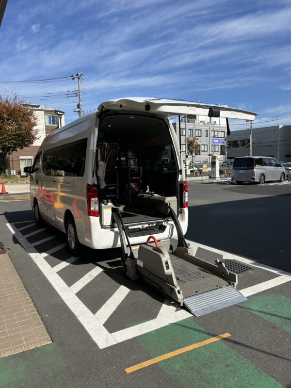弊社の車椅子に移乗したところでエレベーターを使い1階に降りる。先に下の娘様に同乗頂き、続いてリフトを使って患者様も車内にご搭乗。