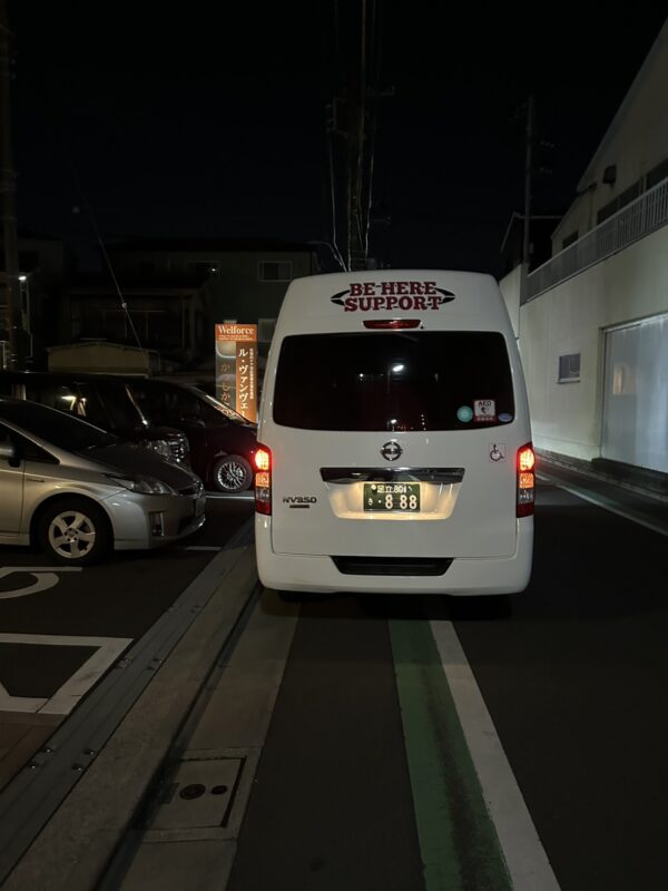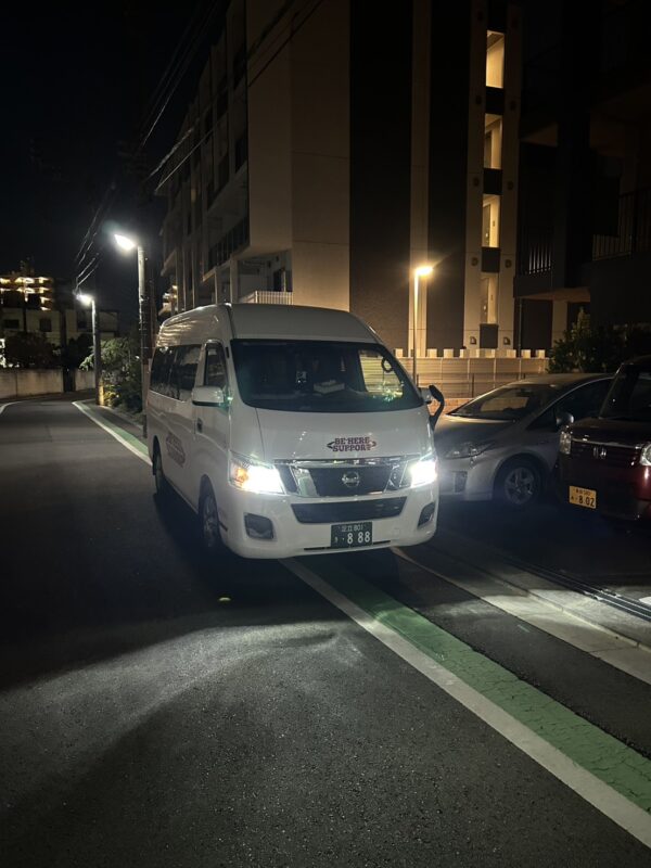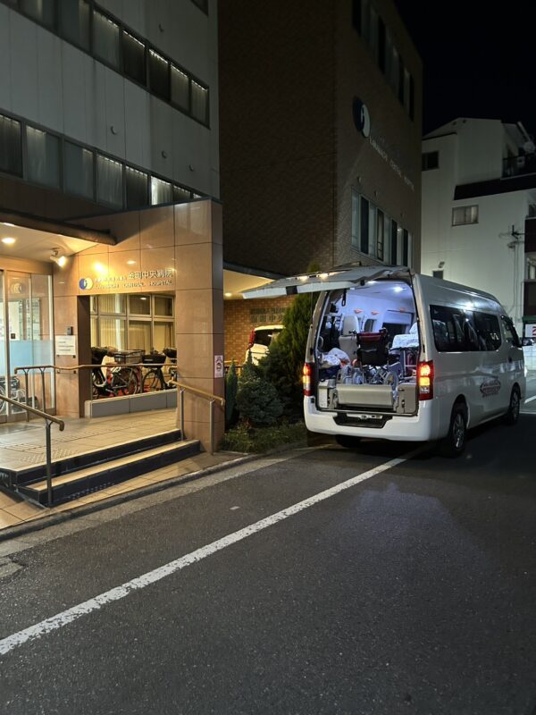 施設に帰る為の搬送依頼だ。搬送の資機材は車椅子。施設スタッフの女性の他に息子様がお付き添いでお待ちしている。