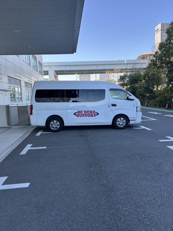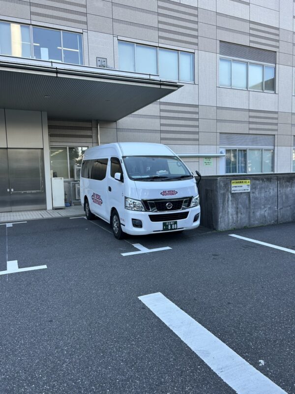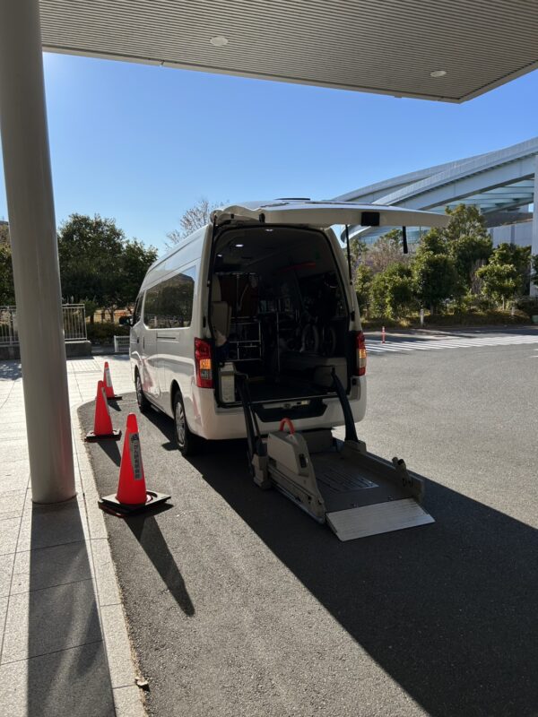 お二人にご挨拶を済ませて、先に荷物を車両に積み込み、患者様が車椅子に乗られたところで