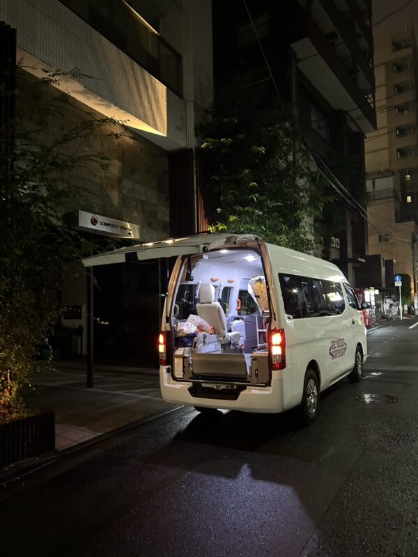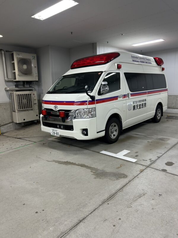 希望の搬送資機材は車椅子。医療行為は無しとの事なので、1時間程で到着すると伝え、急いで順天堂大学医学部附属順天堂医院に向かい出発。
