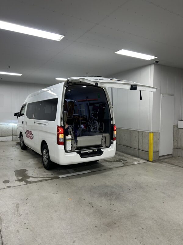 その間にリフターを使い患者様を降ろし、迎えに来た施設スタッフに患者様を引き継ぐ。