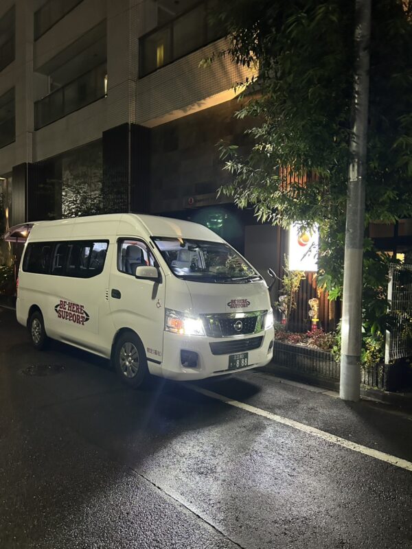 娘様と共に夜間緊急入口を通ってリフターを使い車内にご搭乗。