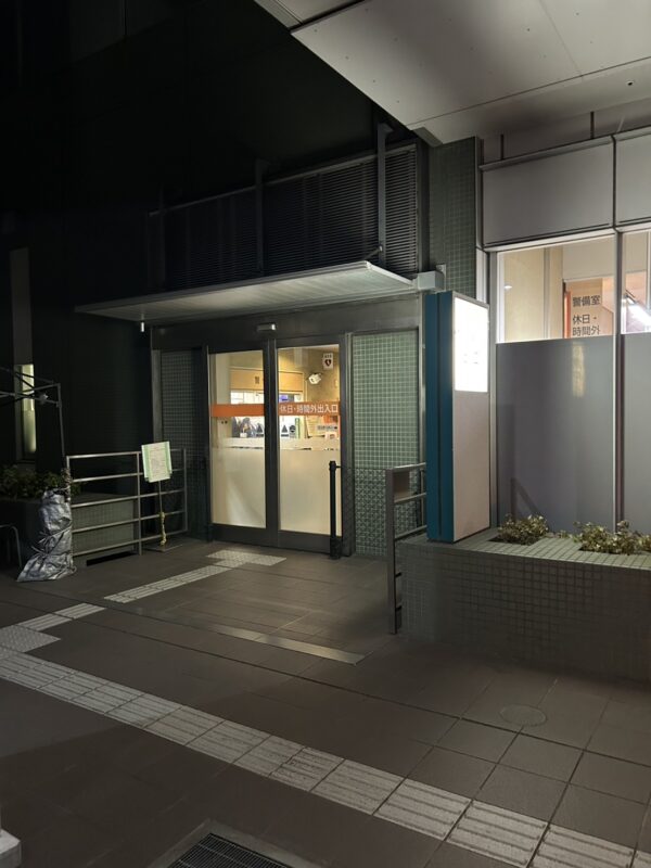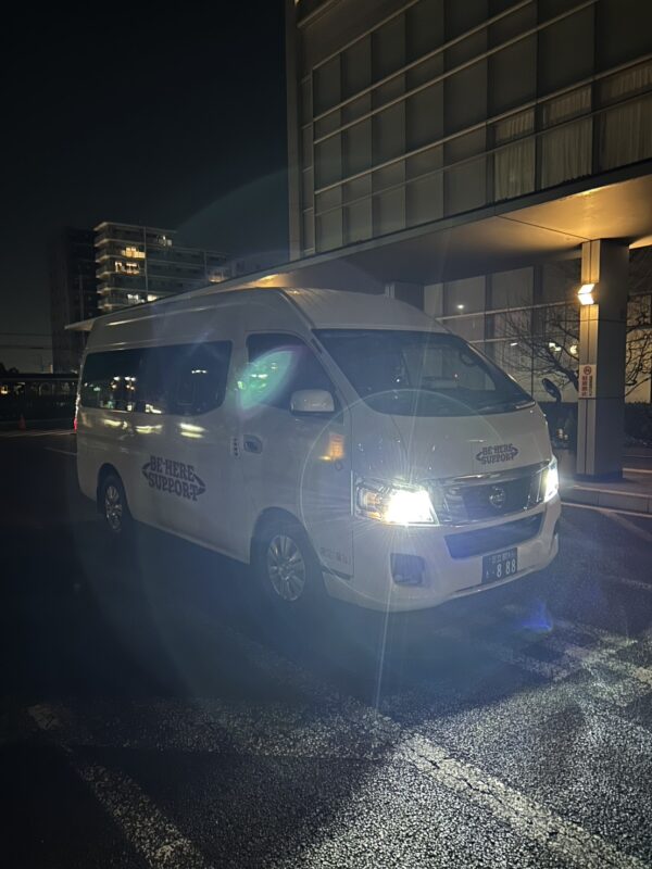 0時半頃、病院到着。夜間緊急入口に車両を停め、車椅子を降ろし院内へ。守衛室に患者様の名前を告げ