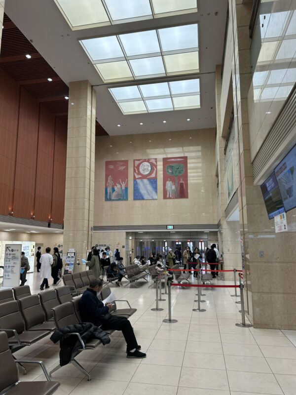 車椅子を押して院内へ。正面玄関付近の空きスペースで病院の車椅子に移乗。