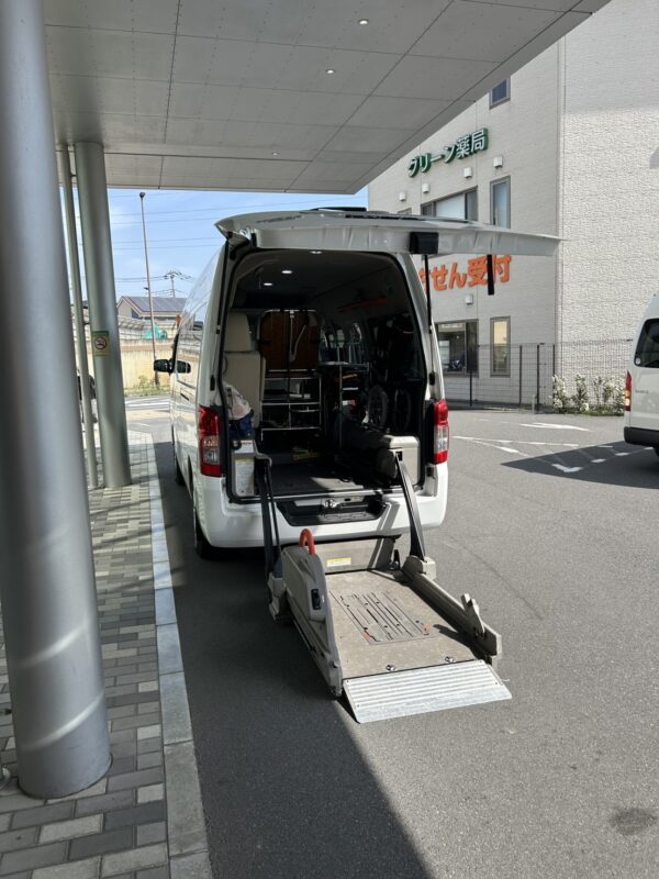 20分程で病院到着。先に奥様に降りて頂き、続いて患者様をリフターを使って降ろし院内へ。
